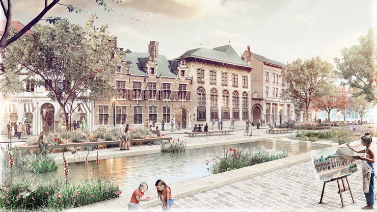 Midden op het plein staat verblijven centraal. Hier wordt onder andere ruimte voorzien voor de eilandterrassen en zitbanken met zicht op het water of het iconische Rubenshuis.